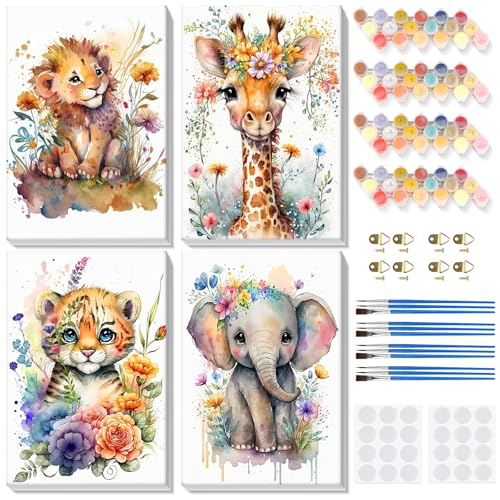 Lxmsja 4-pack djur måla efter siffror lejon för vuxna med ram, tigermålning efter siffror för vuxna på duk, gör-det-själv akryl elefant giraff målningskit konst och hantverk för heminredning, 20 x 30
