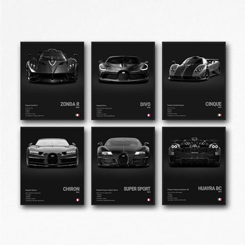 Bugatti Pagani Super Car affischer – set med 6, utan ram 20 x 30 cm (8 x 12 tum) för pojksovrum