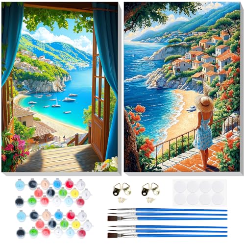 Lxmsja 2 stycken måla efter siffror vuxna med ram, landskapsmålning efter nummer kit nybörjare med 3 pennor, kreativa hobbyer vuxna presentidéer kvinnor heminredning - 20 x 30 cm