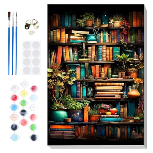 Lxmsja Bokhylla måla efter siffror för vuxna nybörjare med ram, bokhylla målning efter siffror för vuxna på duk, gör-det-själv akrylmålningskit konst och hantverk gåvor för heminredning, 20 x 30 cm