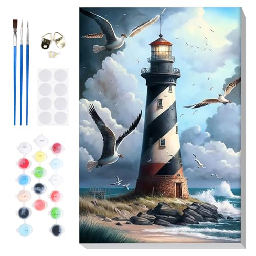 Lxmsja Landskap måla efter siffror för vuxna nybörjare med ram, fyr havsmålning efter siffror för vuxna på duk, gör-det-själv akrylmålningskit konst och hantverk gåvor för heminredning, 20 x 30 cm