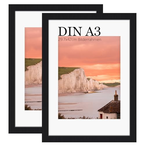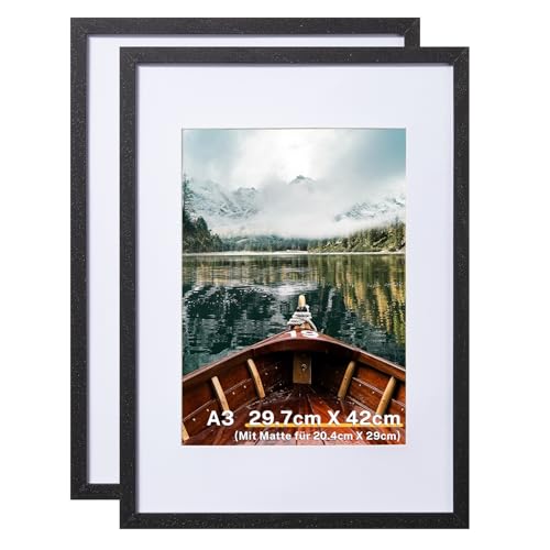 UHOUSEST A3 bildram 29,7 x 42 cm, träram för tryck, svart ram med passedel, affischram, väggmontering möjlig (set med 2 st)