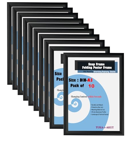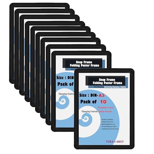 TUKA-i-AKUT 10X A3 Snäppram aluminium affischram rundade hörn, 25 mm aluminiumprofil, anslagsskylt tavla ram vikbar ram reklam visar affischhållare, svart färg TKD8421-A3-10X