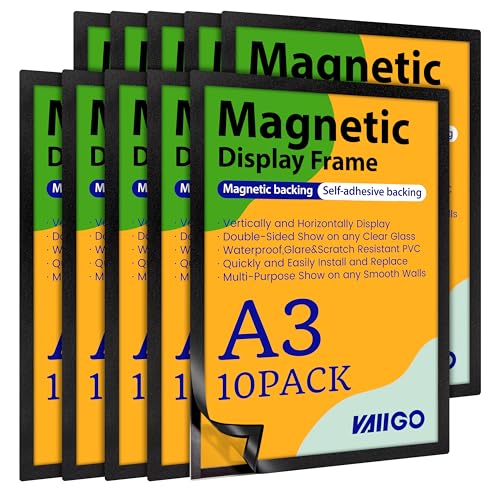 VAIIGO 10 stycken magnetram A3, självhäftande magnetisk informationsram, med magnetlås för informationsram, hållbar magnetisk ram för restauranger och kontor och butiker, svart