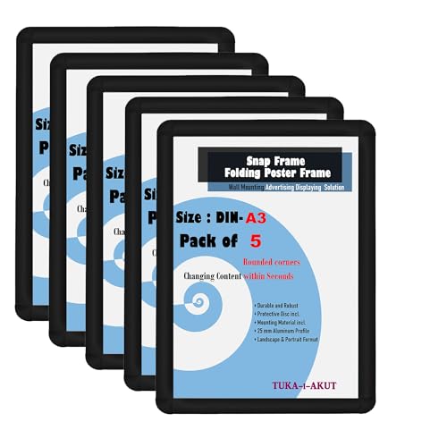 TUKA-i-AKUT 5X A3 Snäppram aluminium affischram, 25 mm aluminiumprofil, anslagsskylt tavla ram väggmontering hopfällbar ram, reklamskärmar klämma affischhållare, svart färg TKD8420-A3-5X