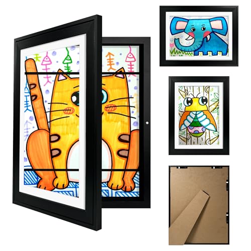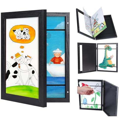 Giftgarden bildram barnritningar A4 svart – utbytbar ram trä med främre öppning, barns konstram för upp till 150 konstverk och teckningar – gåva