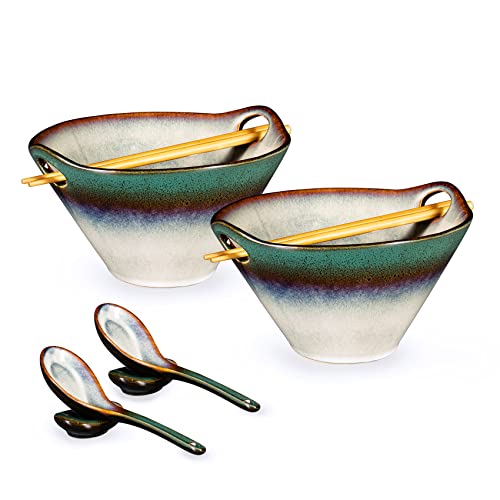 HENXFEN LEAD Porslin ramenskålset, 2 st 780 ml japansk keramik ramen skål med ätpinnar och sked för soppa, sallad, pasta, spannmål och nudlar - grön
