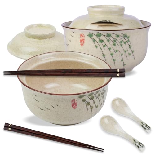 DEARBAG Set med 2 japanska keramiska ramenskålar, 800 ml stor soppskål med lock ätpinnar sked för udon soba hor fun ramen nudlar sallader soppor, diskmaskinssäker (B)