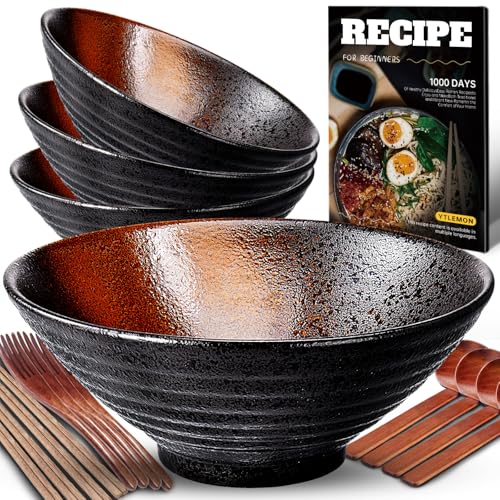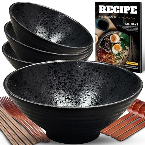 Ramen Skål Keramikset 4×1000 Ml, 34 Oz Japansk Porslinsservis Med Gaffel Ätpinnar Sked Och Recept Soppskålar Blandningsskålar För Nudlar Spannmål Sallader Presenter Till Nya Hem