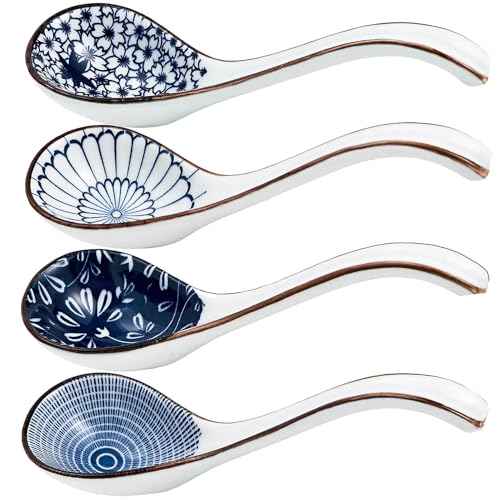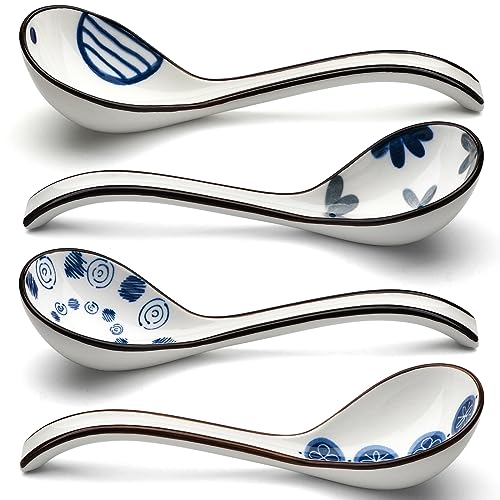 Keramiska soppskedar set med 4 japanska porslin soppsked långt handtag asiatisk soppsked set för Pho Ramen nudlar Wonton dumpling ris (modell 6#)