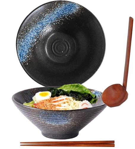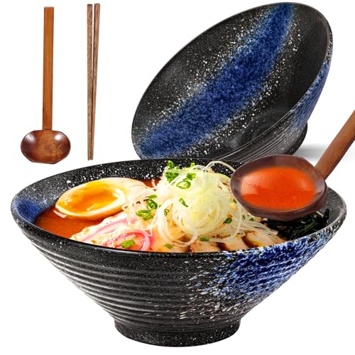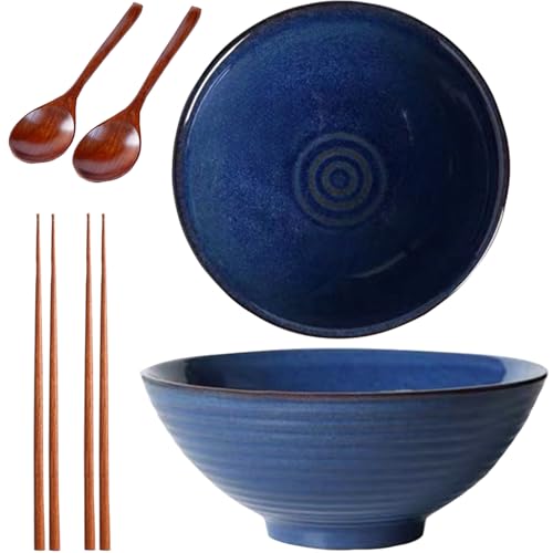 Sightday Ramen skål set med 2 med ramen-skedar och ätpinnar – stor keramisk nudelskål för pasta, soppa, sallad, flingor (blå) – 1 200 ml kapacitet