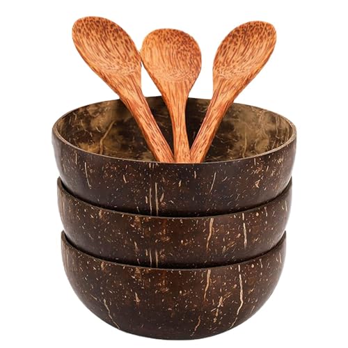 MLKLDOU kokosskålsset – 3 kokosskålar och 3 skedar, handgjorda träbestick, efterrätt frukt sallad blandningsskål ris ramen skål