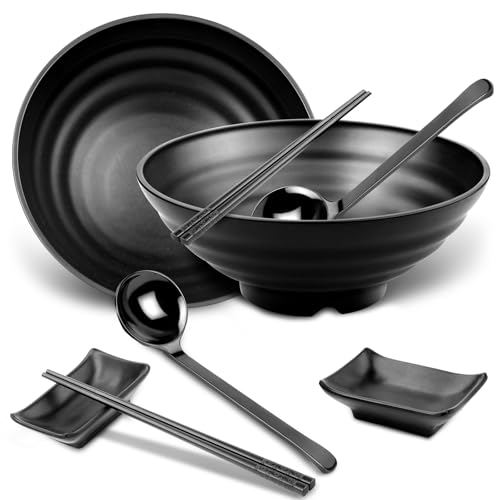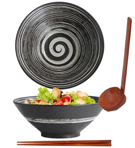 Sosayet Ramen skål keramik, 2 uppsättningar (6 stycken) ramenskål med sked och ätpinnar, halkfri japansk skål rätter för ramen, sallad, müsli, 1000 ml, 20 x 20 x 8 cm