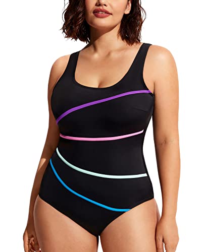 DELIMIRA baddräkt för kvinnor stor storlek mage way ett stycke badmode figurformande U urringning randig, svart, 48
