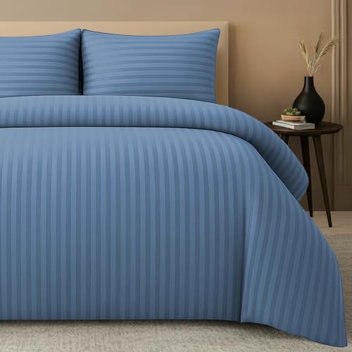 Pamposh Bäddset, satin, randigt, i hotellkvalitet, påslakan, allergivänligt och ultramjukt bäddset i mikrofiber, marinblått, dubbelsäng, 200 x 200 cm