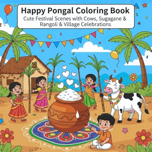 Happy Pongal Coloring Book: Cute Festival Scenes with Cows, Sugarcane, Rangoli & Village Celebrations
