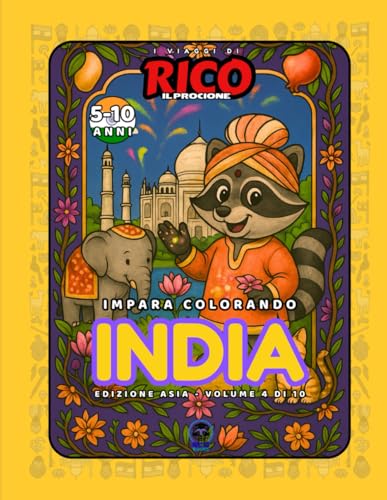Rico il Procione Esplora l’India – Libro da Colorare per Bambini: Taj Mahal, Elefanti e Rangoli | Filastrocche Educative | Età 4–8