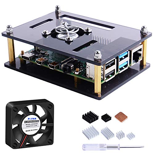 GeeekPi Akrylfodral för Raspberry Pi 4 Model B Med Fläkt Och 4 Kylflänsar (Endast för Pi 4) (Svart Och Klar)