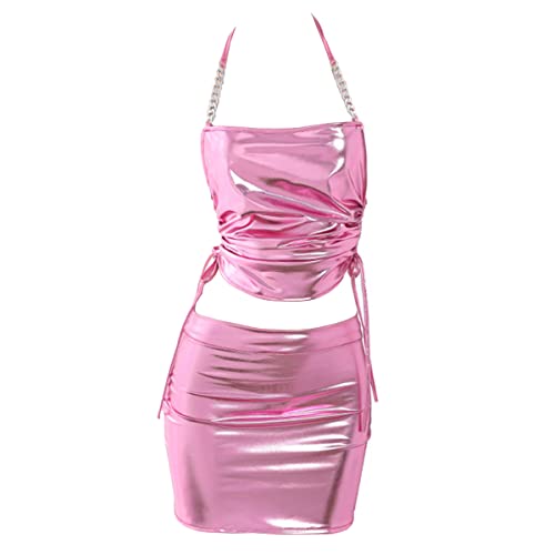 SNOMYRS Wet Look rave-kläder läder PVC-kedja glänsande minikjol set holografisk grimma fest klubbkläder musikfestival, Rosa