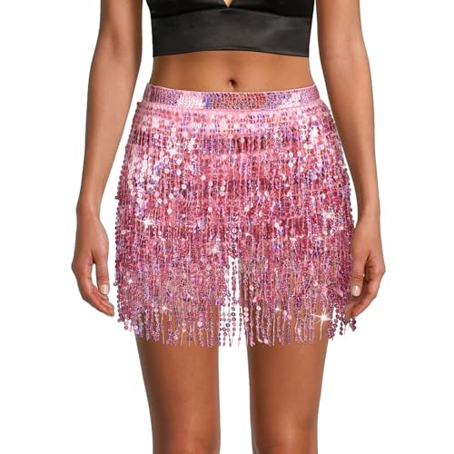 OFFCUP Paljettkjol, magdanskjol, kostym rave minikjolar, tofskjol för prestandakostymer för kvinnor och flickor magdans, zumba eller yogaklass, festivaldansshow, Rosa, S