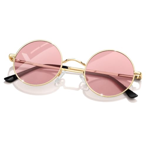 KANASTAL Runda solglasögon för män och kvinnor Klassiska retro solglasögon Runda med metallbågar Vintage Hippie Rave-glasögon UV400-skydd, guldbågar Ljusrosa glas