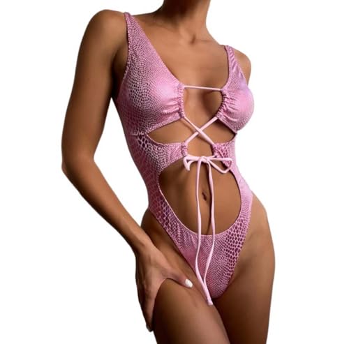 Newfancy Womens Rave Wear One Piece Bodysuit Snakeskin Print Sexy Mentalic Halter Swimsuit for Festival Dance Rave Clothing Pink