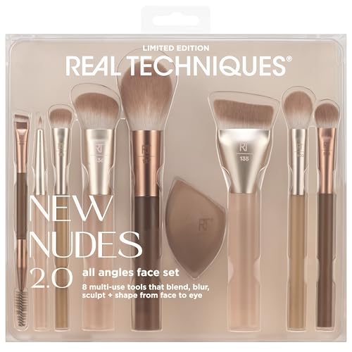 Real Techniques New Nudes 2.0 All Angles Face 10 Piece Set, Face & Eye Makeup Brushes, Includes Makeup Sponge, For Foundation, Concealer, Blush & Eyeshadow, Cruelty-Free