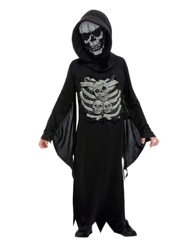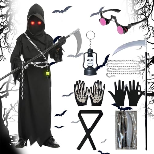 Vmxlso Sensenmansdräkt barn, 128 cm halloweenkostym barn lieman, halloween liemannen cosplay kostym, med huva, lysande ögon, sensor, kedjebälte, grim reaperkostym för halloweenfest