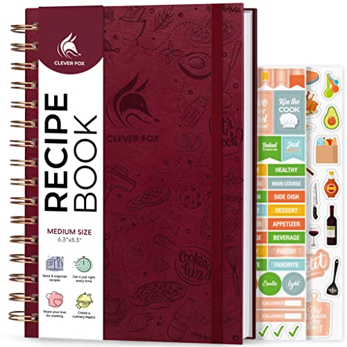 Clever Fox receptbok spiral – gör din egen familj kokbok – tomt recept anteckningsbok organiserare – tom matlagningsdagbok att skriva i recept – medelstorlek, 16 x 21 cm, inbunden (vinröd)