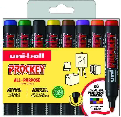Uni Prockey Marker 8St Set Angular Tip (Svart, Röd, Blå, Grön, Gul, Brun, Orange, Violett) Linje 5,7Mm - Vattenbaserat Bläck, Waterproff, Fadeproff, Luktfritt Bläck