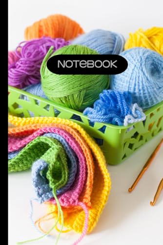 Notebook/ Journal | Green, Blue, Purple, Orange, and Yellow, Crocheted Project Pieces in a Green Basket | 6"x9" | 120 Lined pages