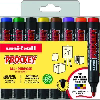 Uni Prockey Marker 8St Set Rund Spets (Svart, Röd, Blå, Grön, Gul, Brun, Orange, Violett) Linje 1,8-2,2Mm - Vattenbaserat Bläck, Waterproff, Fadeproff, Luktfritt Bläck