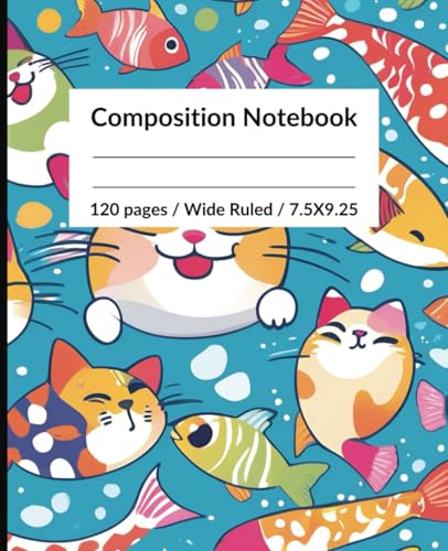 Composition Notebook: Anime Cats and Fish | Blue, orange, yellow, green, purple | 120 pages wide ruled | 7.5 X 9.25 | For teens, adults, children