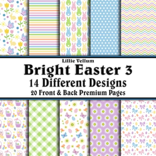 Scrapbook Paper - 20 Front and Back Premium Color Pages: Bright Easter Patterns 3 - Spring Blue Pink Purple Yellow Orange Green Bunny and Eggs - 8.5"x8.5"