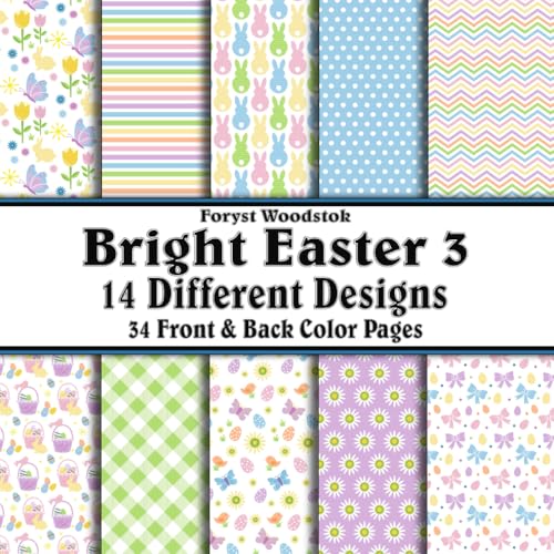 Scrapbook Paper - 34 Front and Back Full Color Sheets: Bright Easter Patterns 3 - Spring Blue Pink Purple Yellow Orange Green Bunny and Eggs - 8.5"x8.5"