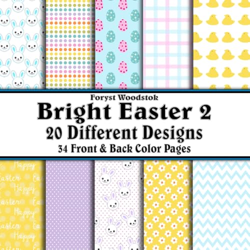 Scrapbook Paper - 34 Front and Back Full Color Sheets: Bright Easter Patterns 2 - Spring Blue Pink Purple Yellow Orange Green Bunny and Eggs - 8.5"x8.5"