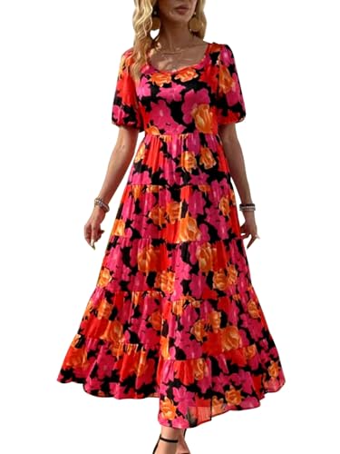 PRETTYGARDEN Short Sleeve Floral Maxi Dresses for Women 2025 Wedding Guest Summer Dress Flowy Beach Vacation Outfits (Black Red Flower,Large)