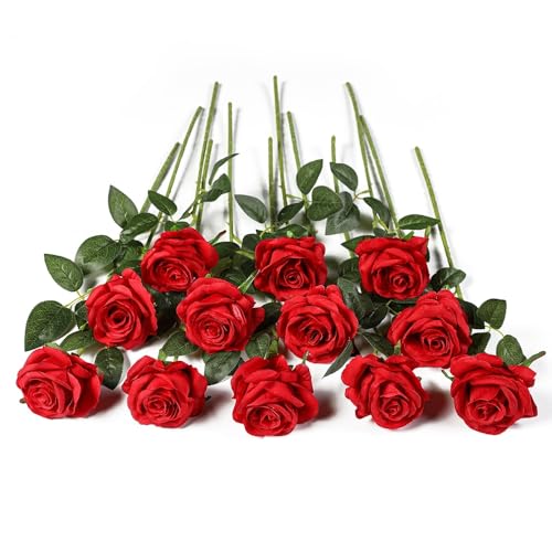 Kisflower 12 Pcs Red Roses Artificial Flowers with Stems Silk Roses Fake Rose Realistic Flower Bouquet for Wedding Party Office Home Decor (Red)
