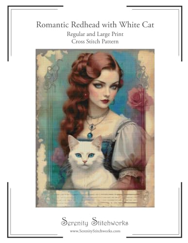 Romantic Redhead with White Cat Cross Stitch Pattern: Regular and Large Print Cross Stitch Pattern
