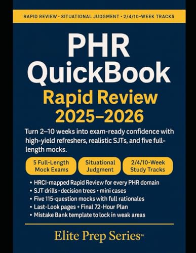 PHR QuickBook: Rapid Review 2025–2026: Last‑minute refreshers, situational questions & five full‑length mocks aligned to the HRCI PHR outline