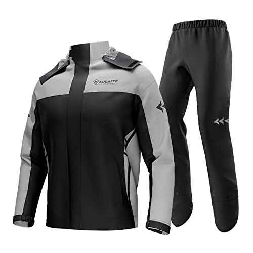Fesjoy Regnjacka, vattentät motorcykel-regndräkt för män och kvinnor, cykling cykel regnkläder, jacka och byxor med förvaringsväska, regnjacka vattentät andas, Svart och grå, X-L, Poncho-kappa