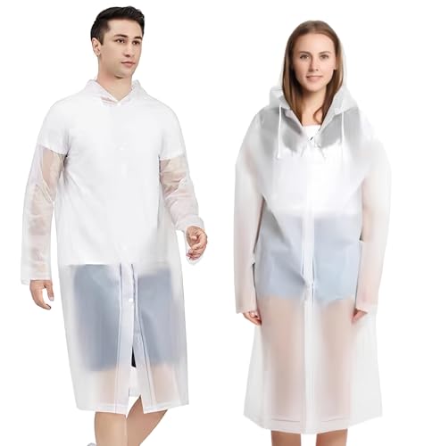 SHOCHX Regnponcho-regnrockar för vuxna, 2-pack män kvinnor vattentät regnrock regnkläder med huvor och ärmar, återanvändbar regnbeständig poncho för nödsituation, utomhus, camping, Disney, resor, Vit