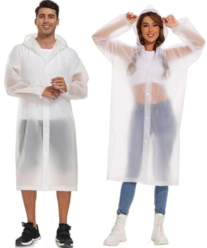 YingErTool Regnponcho-regnrockar, 2 st EVA återanvändbar regnrock jacka akut för kvinnor män med huva och dragsko, Vitt, one size