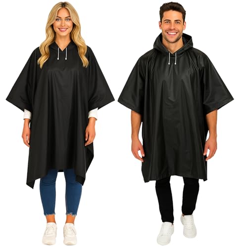 REDSTAR Regnponcho i 2-pack, långa och vattentäta regnrockar för vuxna, med huva, återanvändbara, packbar regnjacka som festivaltillbehör, Svart, one size