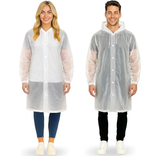 SHOCHX Regnponcho-regnrockar för vuxna, 2-pack män kvinnor vattentät regnrock regnkläder med huvor och ärmar, återanvändbar regnbeständig poncho för nödsituation, utomhus, camping, Disney, resor, Vit