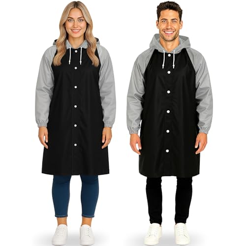REDSTAR Regnponcho i 2-pack, långa och vattentäta regnrockar för vuxna, med huva, återanvändbara, packbar regnjacka som festivaltillbehör, Svart/grå, one size