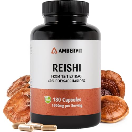 Reishi-kapslar 180 stycken - 1400mg svampextrakt per portion - 40% bioaktiva polysackarider | Högdos Ganoderma Lucidum svamp | Vegan, allergen och glutenfri | Ambervit