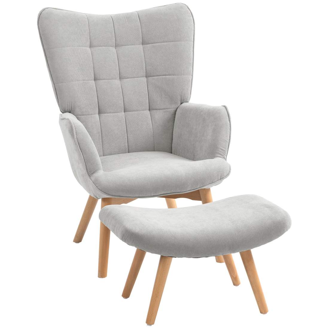 Vingestol med pall, relaxstol, stoppad stol i manchesterlook, fåtölj, fåtölj med träben, TV-stol för vardagsrum, grå