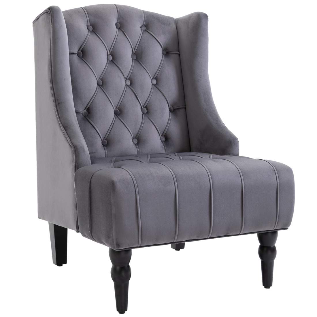 Gungstol med pall, relaxstol med dyna, sammetslook, vingstol med träben för sovrum, vardagsrum, 66 x 96 x 101 cm, mörkgrå