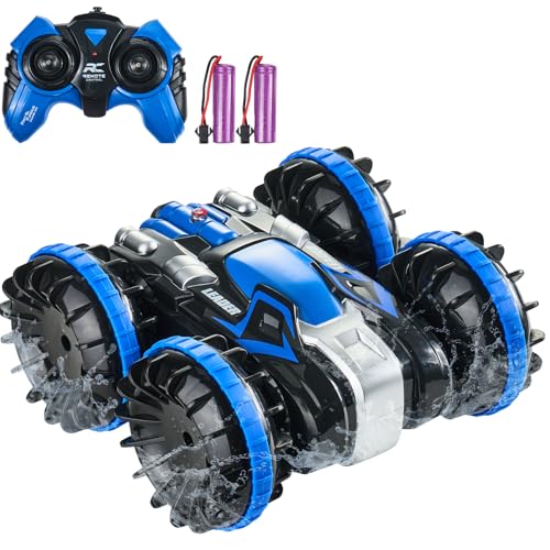 VEVOR Radiostyrd amfibiebåt 2,4 GHz, 12 km/h, 4WD, vattentät med 360° rotation och 2 batterier, terrängleksak för strand, pool och vatten för barn över 6 år, blå